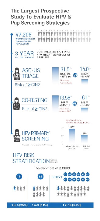 That cervical cancer screening is now available: In 2011, the United Statesâ Food and Drug Administration (FDA) approved the first HPV DNA Test that allows HPV 16 and HPV 18 genotyping concurrently.3 The approval was based on the ATHENA trial,4 a multicenter, prospective study supported by Roche, which enrolled over 47,000 women above 21 years of age undergoing routine cervical cancer screening. Results from the ATHENA trial revealed that one in 10 women who tested positive for HPV 16/18 had high-grade cervical disease that was missed by the Pap test and that after 3 years of follow-up one in four women with HPV 16 had developed high-grade cervical disease.5 The trial evaluated the performance of the HPV DNA test in multiple clinical situations including atypical squamous cells of undetermined significance (ASC-US) triage and co-testing. The trial showed that the HPV DNA test increases the detection rate to about 93 to 95% of high-grade precursors.3 Cervical cancer screening guidelines in the United States now recommend HPV co-testing to women aged 30 and above.6