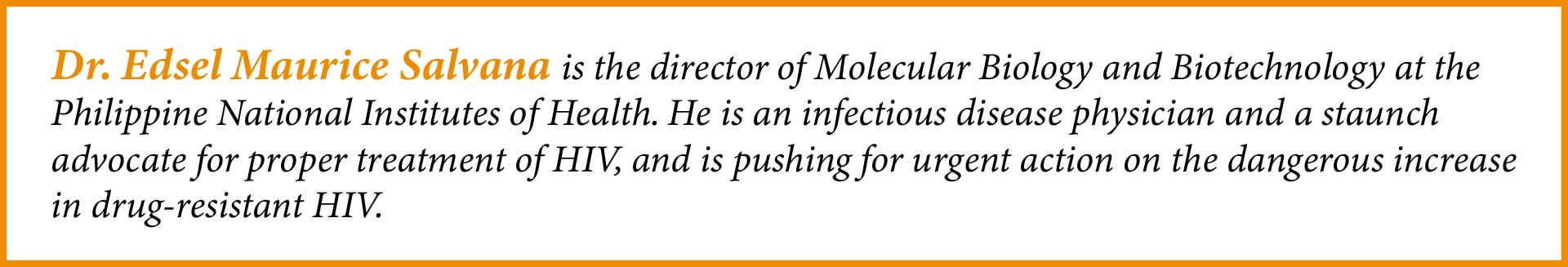 Dr Salvana likens the fight against HIV to malaria, where consistent efforts are needed to see the fight through to the end. “In the early 1960s, malaria was on the ropes. As the number of cases dropped, people and governments stopped paying attention. The result was a deadly resurgence of drug-resistant malaria,” he shared at a TED talk in 2017.