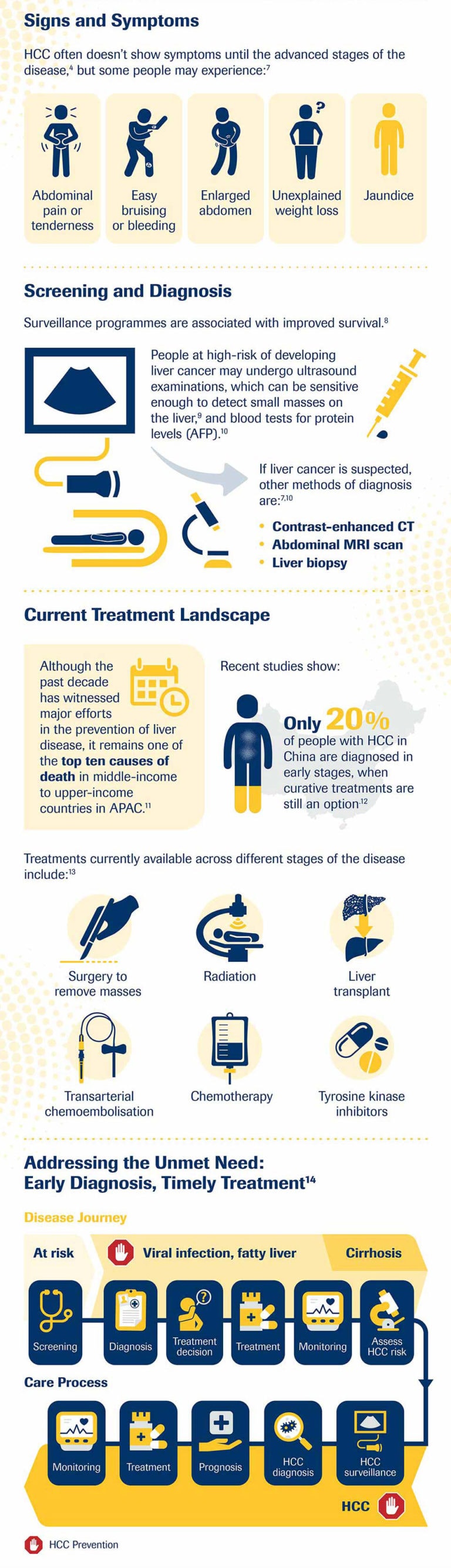 Many cases of liver cancer are often diagnosed at an advanced stage. Less than 50 percent of people with advanced HCC will survive more than a year after diagnosis9. If diagnosed early, it may be possible to cure the cancer completely10.