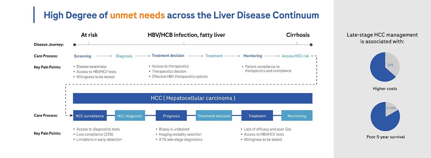 High degree of unmet needs across the Liver Disease Continuum Late-stage HCC management is associated with higher cost (36%) & poor 5-year survival (5-10%).