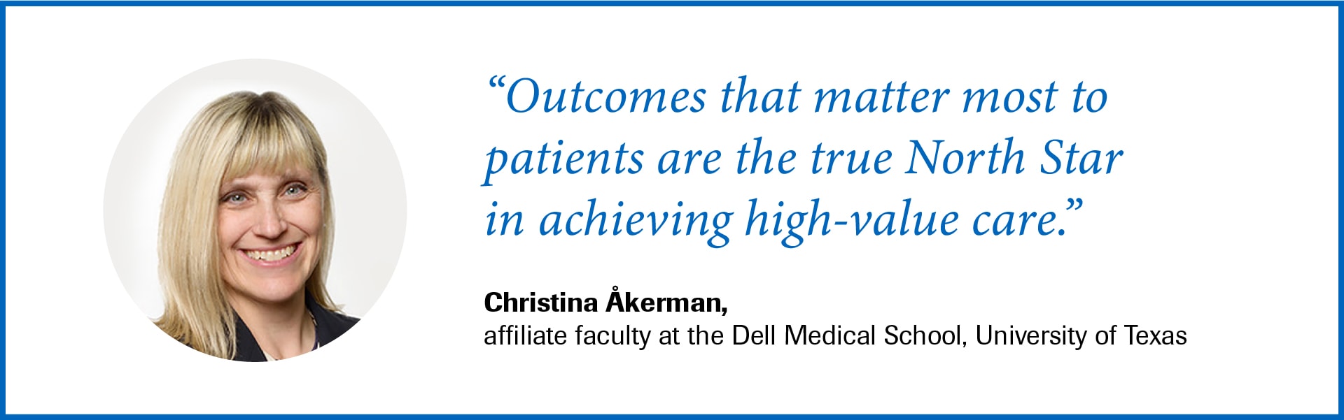 However, itâs not always about saving money. Weighing in on this topic is Dr Christina Ă kerman, Affiliate Faculty at the Dell Medical School, University of Texas. âIf you do not deliver on the outcomes, it doesnât matter how low the cost is because the value will still be zero. Outcomes that matter most to patients are the true North Star in achieving high-value care.â
