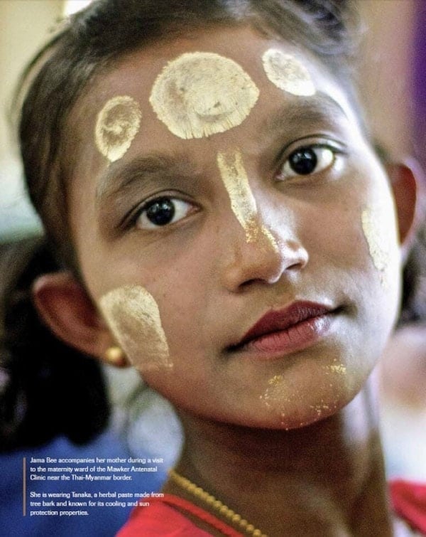 Jama Bee accompanies her mother during a visit to the maternity ward of the Mawker Antenatal Clinic near the Thai-Myanmar border. She is wearing Tanaka, a herbal paste made from tree bark and known for its cooling and sun protection properties.