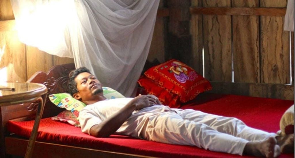 A Cambodian forest worker, Mr Vong Phou recovers at home from yet another attack of malaria, this time by both Plasmodium falciparum and Plasmodium vivax.