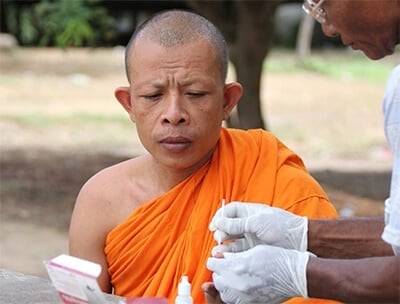 enerable Ong Kim Leang is a Buddhist monk who lives in a secluded monastery in a malaria endemic area at Samlot, Cambodia. A volunteer malaria worker at a mobile clinic is doing a blood test using the Rapid Diagnostic Test.
