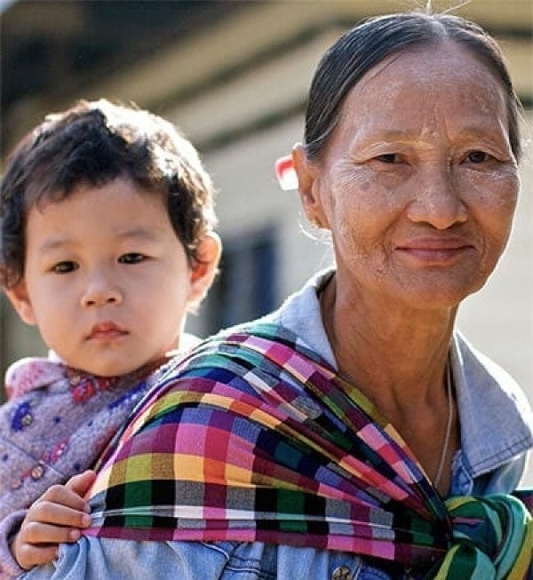 67-year-old Daw Ngwe Tein is babysitting her grandchild, Blu Nay L’Paw. Blu’s mother works as a medic in one of the field clinics of the Shoklo Malaria Research Unit in Mae Sot, Thailand.