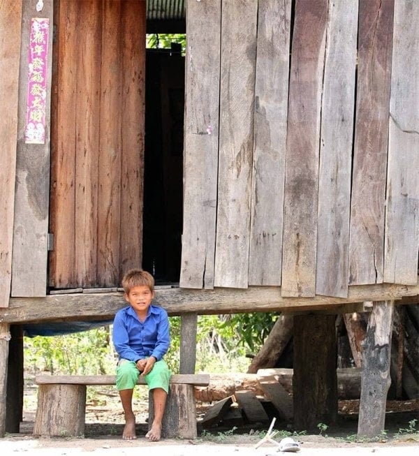 A young Cambodian boy is sits in front of a traditional family house in the rural countryside. The families living here depend on forest and agricultural work as an income source.
