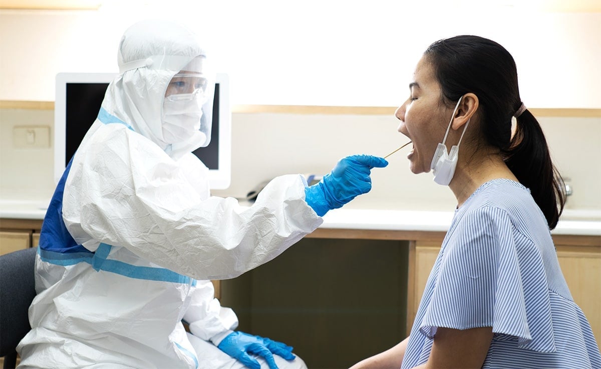 A health worker in protective gear swabs a woman. Experts believe that diagnostic testing remains key to protecting protecting international borders.